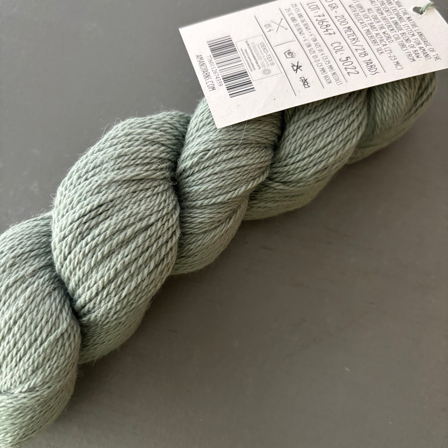 この糸は極上の柔らかさを持つベビーアルパカ(21~23ミクロン)と、繊細な光沢を持つマルベリーシルクをブレンドしています。