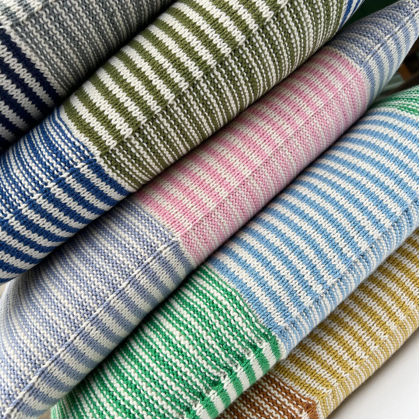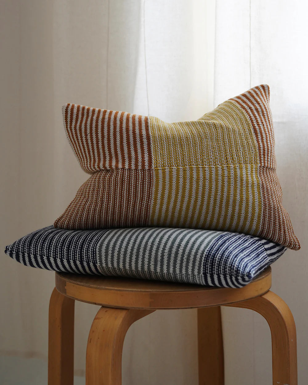 このクッションは、メリヤス編みと裏メリヤス編みを使い、ストライプとパネル模様で編みます。編み終わったら、片側をとじて中にクッションを入れ、最後にもう片側もとじて仕上げます。