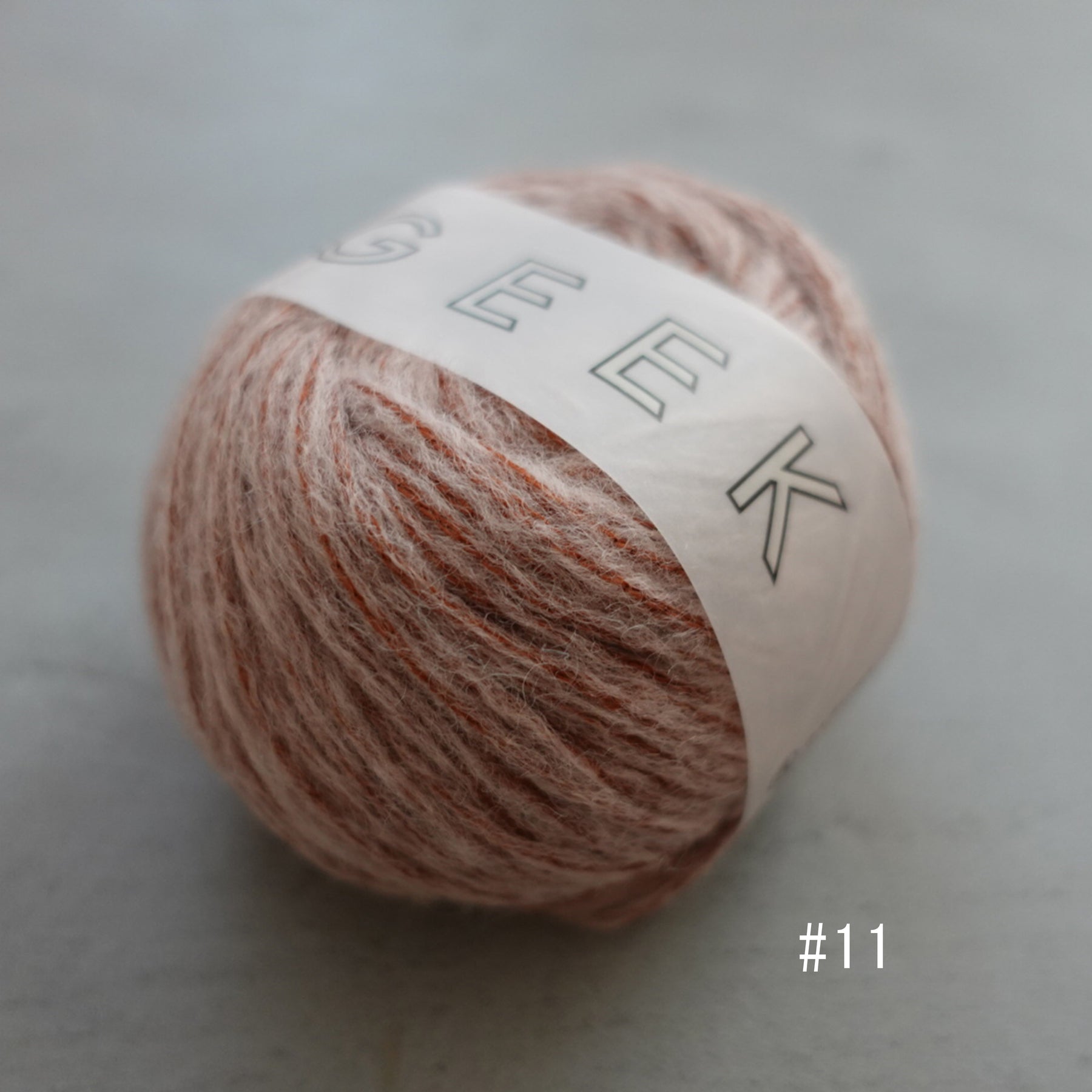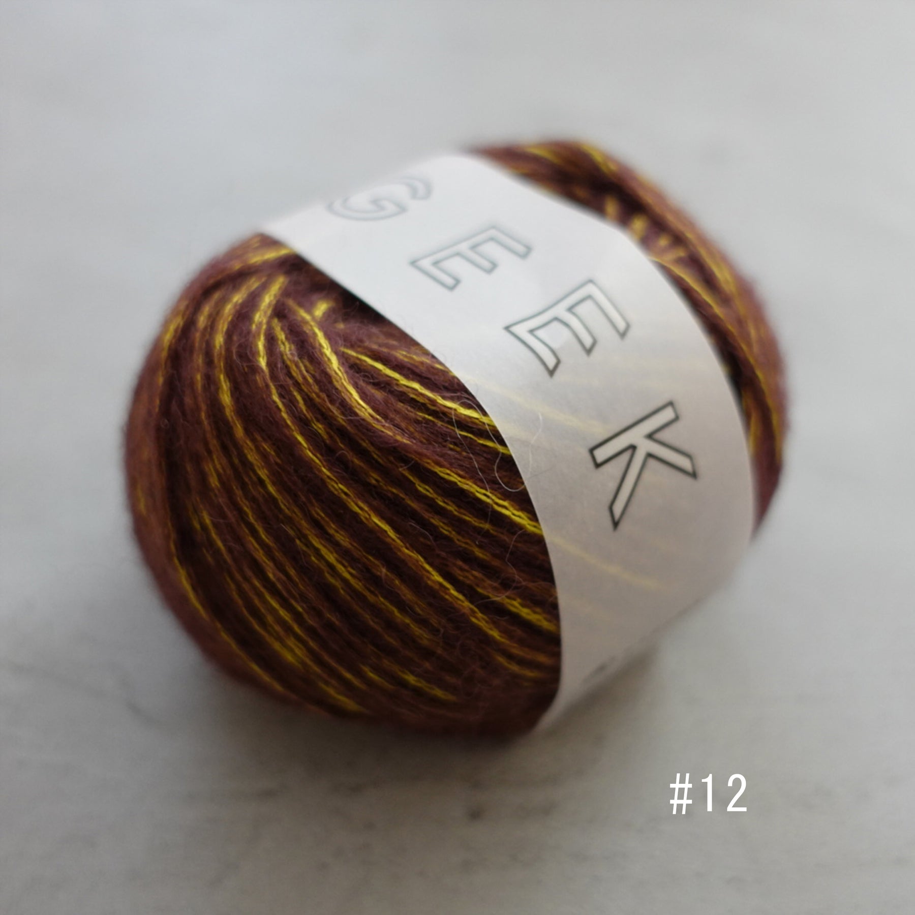 糸の芯と吹き出ているウールの繊維の色を変えた、ユニークな毛糸。 電子部品やネオン照明のような雰囲気があり、ちょっと変わった糸が好き!という方に向けて“マニア”や“オタク”といった意味合いのギークという名前に。 糸と編んだ状態の見え方も違うので、ドライブ編みや、フリンジも面白い表情に仕上がります。 リリーヤーン形状で軽く、糸割れしない編みやすい糸です。他の毛糸と組み合わせたアクセント使いもおすすめです。