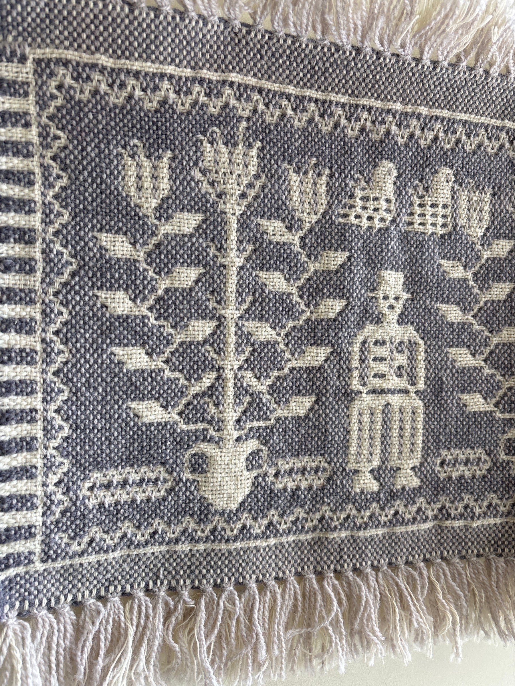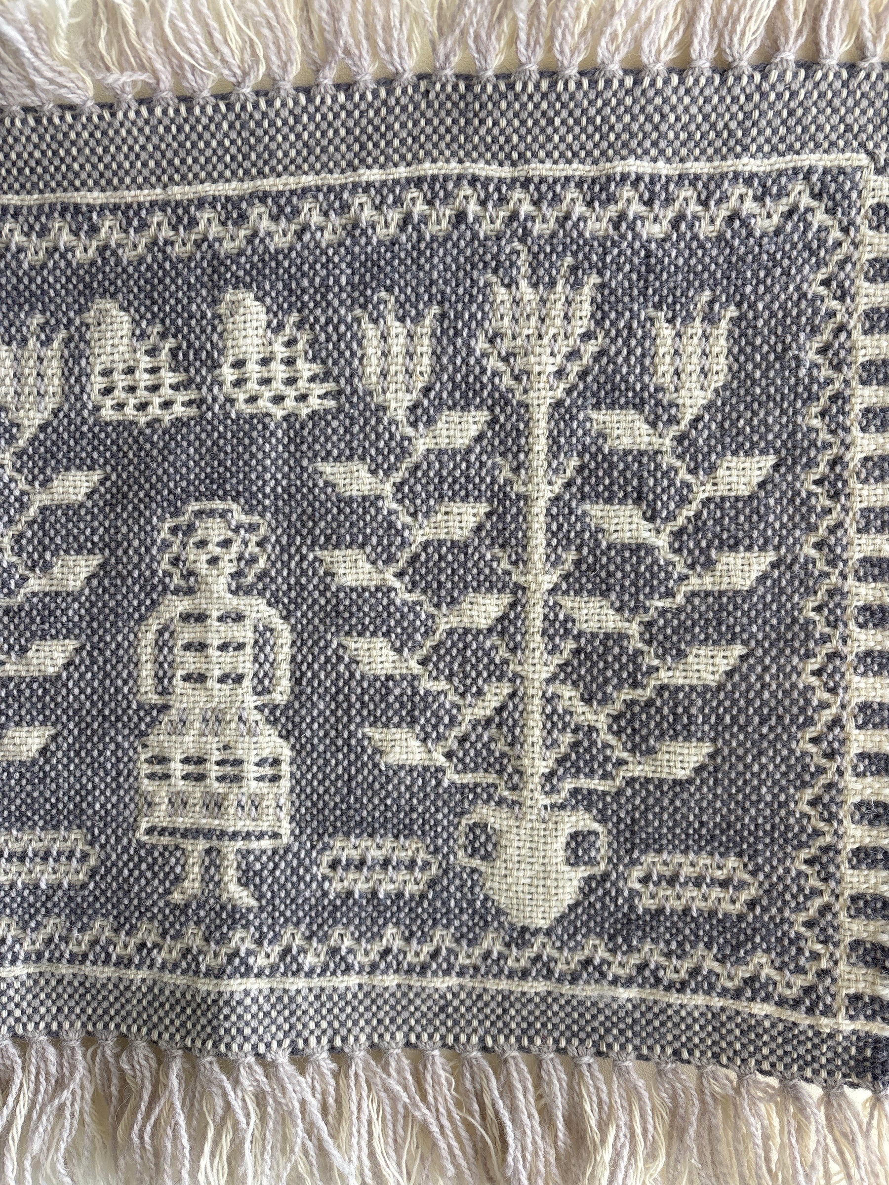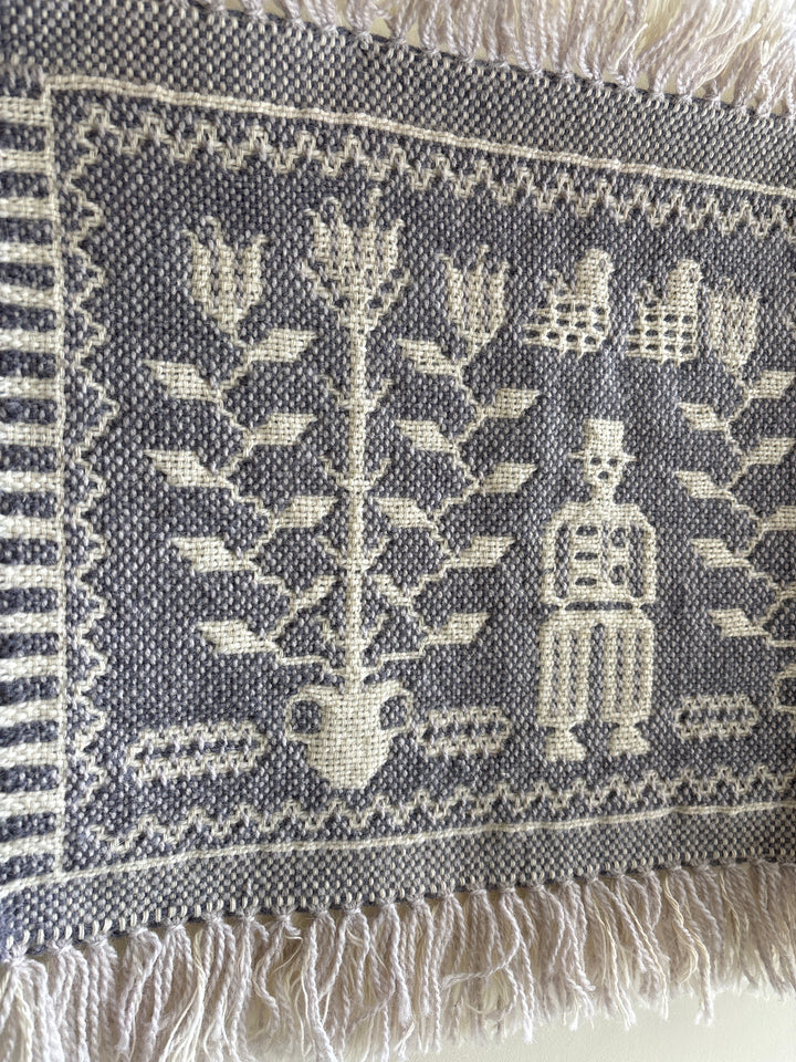 Bernardaさんの作品は、自然豊かな村の生活や伝統行事、風景や動植物などを織り込んだ物語性あるモチーフが特徴です。織りの技術は高く評価され、国立劇場の暗幕や万博の出展作品制作などの国家プロジェクトも多く手がけています。
